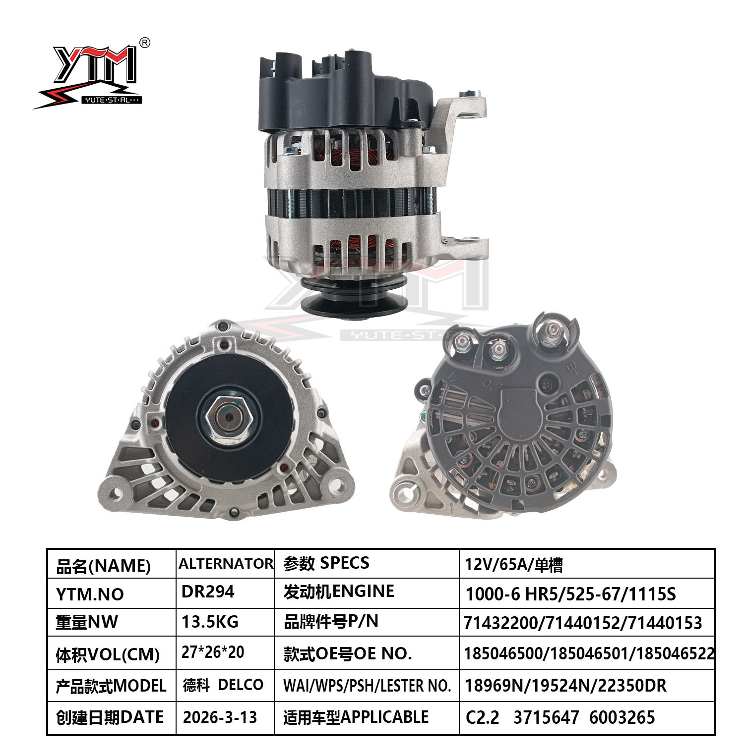 | 강조하다: | DELCO C2.2 car alternator 12V 65A,DELCO alternator 71432200 with warranty,car engine alternator 185046500 compatible |